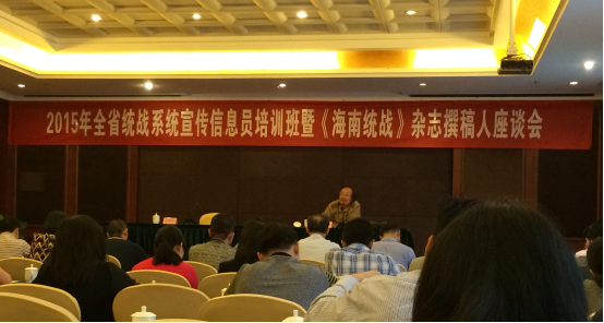 2015年3月25日至27日在?诿廊A荷泰酒店二樓會(huì)議室,由省委統(tǒng)戰(zhàn)部宣傳教育處處長宋星河主持召開了海南省統(tǒng)戰(zhàn)系統(tǒng)宣傳信息員培訓(xùn)暨《海南統(tǒng)戰(zhàn)》雜志撰稿人座談會(huì)。3月25日會(huì)議上,《中共紀(jì)檢監(jiān)察報(bào)》駐海南記者站站長胡慶魁作了新聞寫作與時(shí)政報(bào)道專題講...