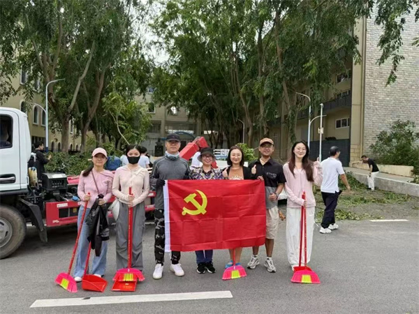 清晨 8:30,學(xué)校魯班廣場上黨旗獵獵,黨員干部們身著防曬服、手持勞動工具整齊列隊。校領(lǐng)導(dǎo)率先扛起粗大樹枝,并帶領(lǐng)隊伍分赴書善樓周邊、R1-R7 宿舍區(qū)開展清理。現(xiàn)場呈現(xiàn)出一幕幕動人場景: