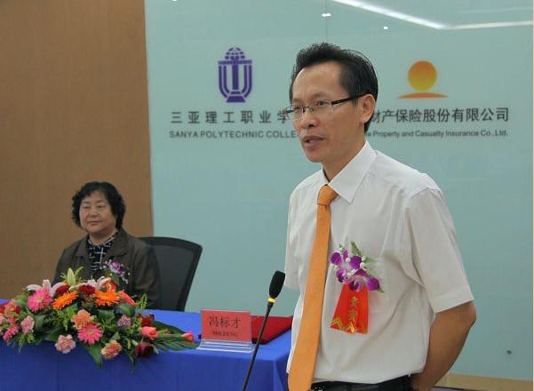 陽光財產(chǎn)保險股份有限公司海南分公司負責(zé)人馮標(biāo)才在簽約儀式上講話,高度評價三亞理工陽光學(xué)子