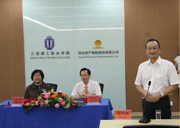 陽光財產(chǎn)保險股份有限公司海南分公司負責(zé)人馮標(biāo)才在簽約儀式上講話,高度評價了三亞理工學(xué)子陽光自信的精神面貌和學(xué)院緊跟市場需求的專業(yè)設(shè)置和人才培養(yǎng)模式,對學(xué)院應(yīng)用型、實用性人才充滿期待。馮標(biāo)才指出,陽光財產(chǎn)保險股份有限公司由中國石化、南方航空、中國鋁業(yè)、中國外運、粵電力等在國內(nèi)有著舉足輕重地位的國有特大型企業(yè)發(fā)起組建,公司對計算機、電子、金融、管理等專業(yè)的人才需求非常大,今后公司將與學(xué)院開展廣泛合作,安排有經(jīng)驗的高管為學(xué)院陽光學(xué)子講授某些實訓(xùn)類課程,公司還將為三亞理工學(xué)子提供大量的實習(xí)和就業(yè)崗位。