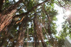 除此之外,校園內(nèi)郁郁蔥蔥,蔚然成林,榕樹功不可沒,從它樹枝上向下生長(zhǎng)的垂掛“氣根”,多達(dá)4千余條,落地入土后成為“支柱根”。這樣,柱根相連,柱枝相托,枝葉擴(kuò)展,形成遮天蔽日、獨(dú)木成林的奇觀。