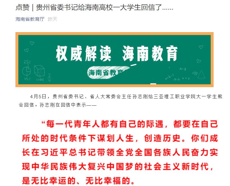 【海南省教育廳官微】點(diǎn)贊 | 貴州省委書記給海南高校一大學(xué)生回信了……