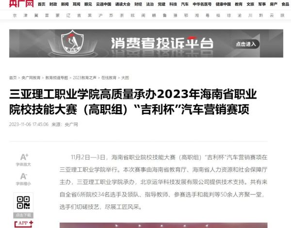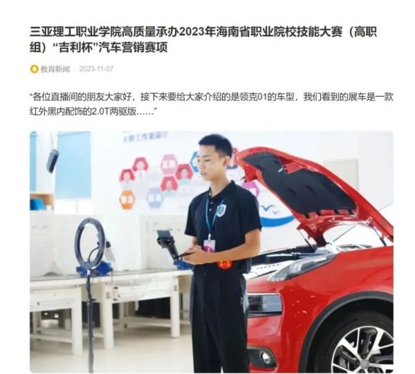 2023年11月2日-3日,海南省職業(yè)院校技能大賽(高職組)“吉利杯”汽車營(yíng)銷賽項(xiàng)在三亞理工職業(yè)學(xué)院舉行。本次賽事由海南省教育廳、海南省人力資源和社會(huì)保障廳主辦,三亞理工職業(yè)學(xué)院承辦,北京運(yùn)華科技發(fā)展有限公司提供技術(shù)支持。共有來自全省6所院校34名選手及領(lǐng)隊(duì)、指導(dǎo)教師、參賽選手和裁判等50余人齊聚一堂,選手們切磋技藝,盡展工匠風(fēng)采。
