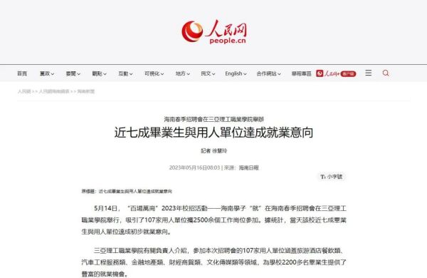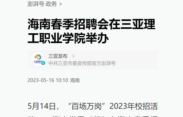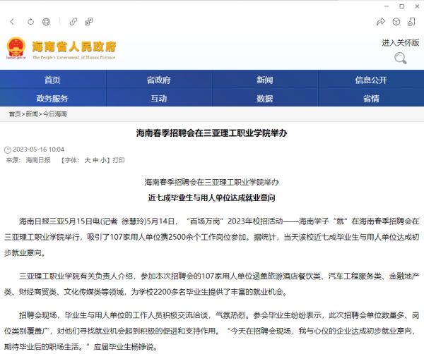 2023年5月14日,“百場(chǎng)萬崗”2023年校招活動(dòng)——海南學(xué)子“就”在海南春季招聘會(huì)在三亞理工職業(yè)學(xué)院舉行,吸引了107家用人單位攜2500余個(gè)工作崗位參加。據(jù)統(tǒng)計(jì),當(dāng)天該校近七成畢業(yè)生與用人單位達(dá)成初步就業(yè)意向。