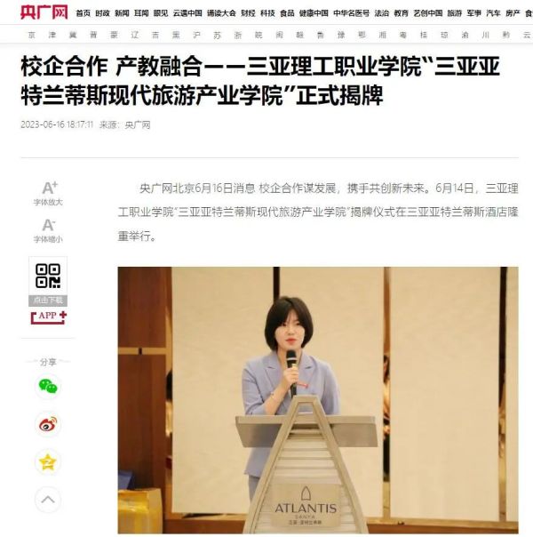 2023年6月14日,三亞理工職業(yè)學(xué)院“三亞亞特蘭蒂斯現(xiàn)代旅游產(chǎn)業(yè)學(xué)院”揭牌儀式在三亞亞特蘭蒂斯酒店舉行。