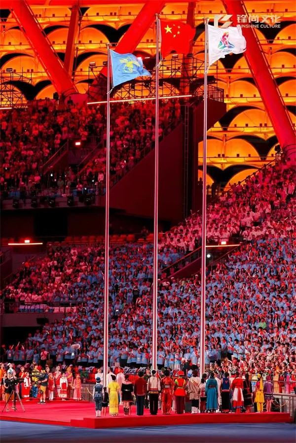 入場儀式完畢,全場起立,高唱中華人民共和國國歌,五星紅旗冉冉升起、迎風飄揚。