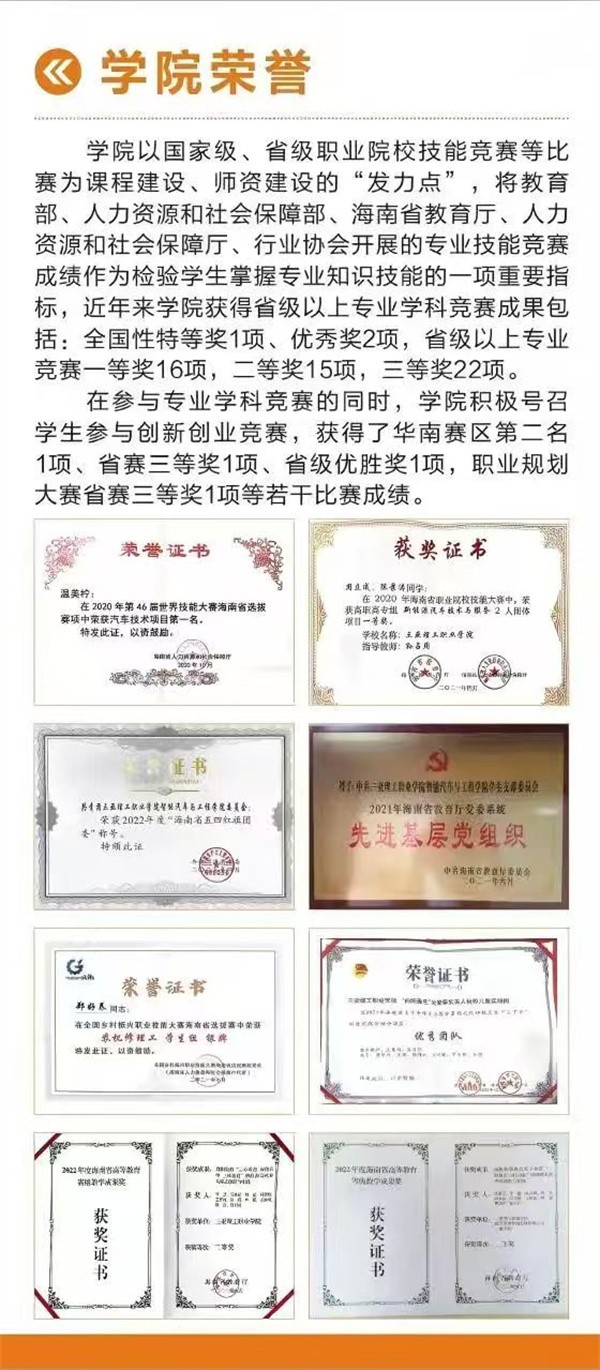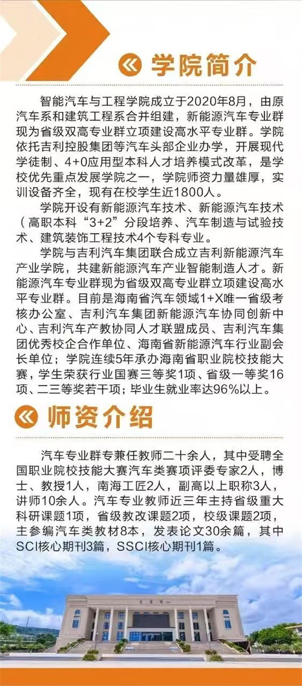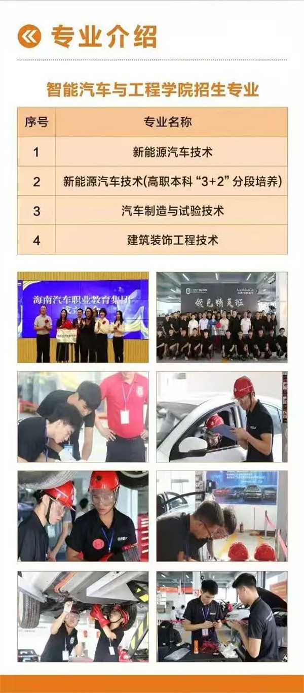 學院開設有新能源汽車技術(shù)、新能源汽車技術(shù)(高職本科“3+2”分段培養(yǎng)、汽車制造與試驗技術(shù)、建筑裝飾工程技術(shù)4個?茖I(yè)。其中新能源汽車專業(yè)群現(xiàn)為海南省高水平專業(yè)群。